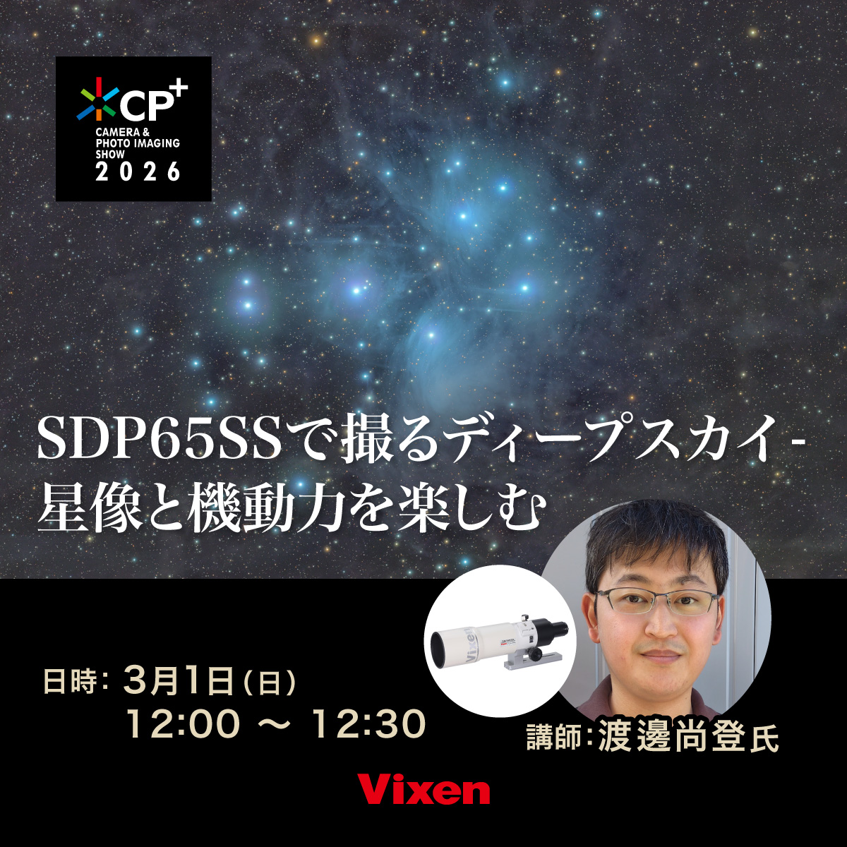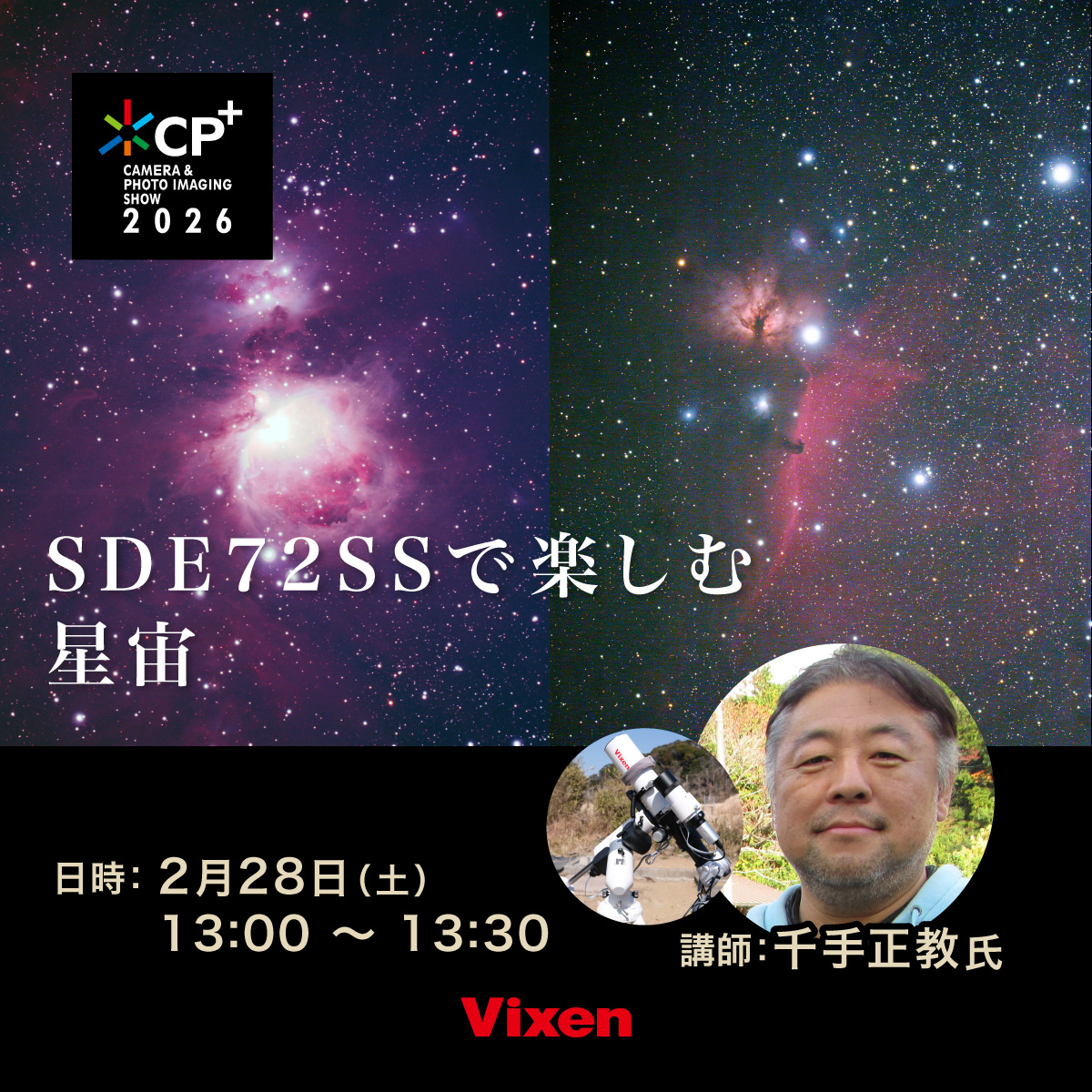 CP+2024で発表したSDE72SS鏡筒を発表時の作例撮影から使っている講師が、使いこなしなど詳しく解説!SDE72SSの特徴である「観望」から「撮影」まで、搭載する赤道儀まで含め、講師が普段使いのシステムを含めて解説していきます。おススメのアイテムなども紹介します。