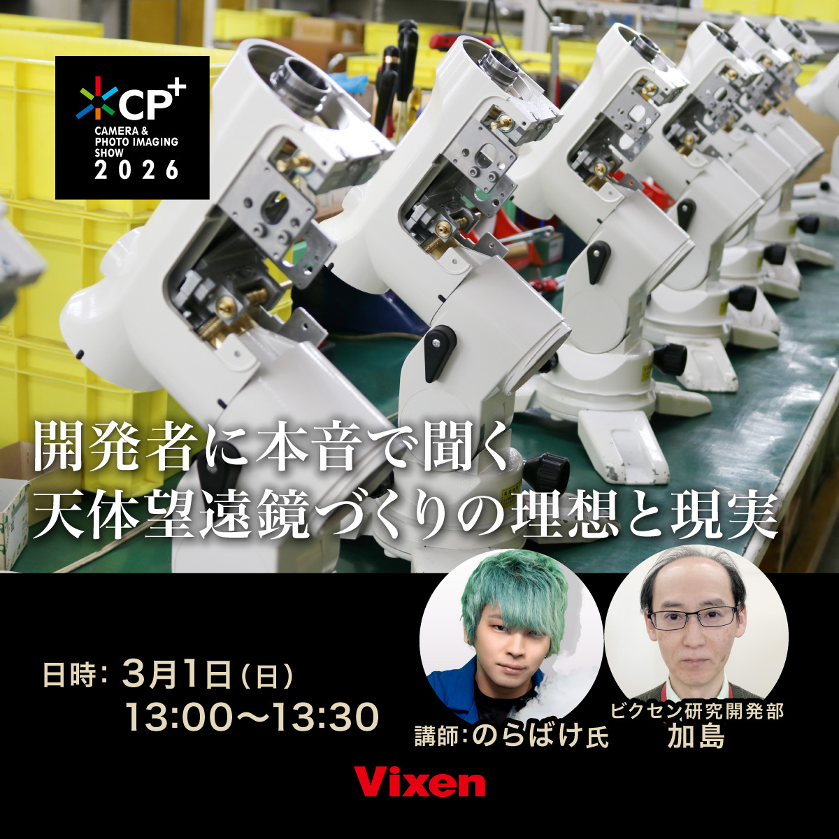 サイエンスエンターテイナーの「のらばけ」さんと、ビクセン研究開発部 加島による対談トークショー。製品化までの流れや「譲れない条件」など、普段は聞けない研究の裏側に迫ります。ふたりで100年後の天体観測にも思いを馳せる場面も??