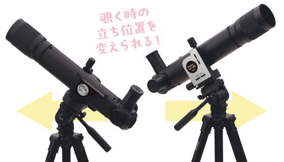 ピント調整のときに右利き・左利きどちらも使いやすいユニバーサル設計。接眼レンズを取り付ける位置を変えることで望遠鏡を覗く時の立ち位置を変えられます。