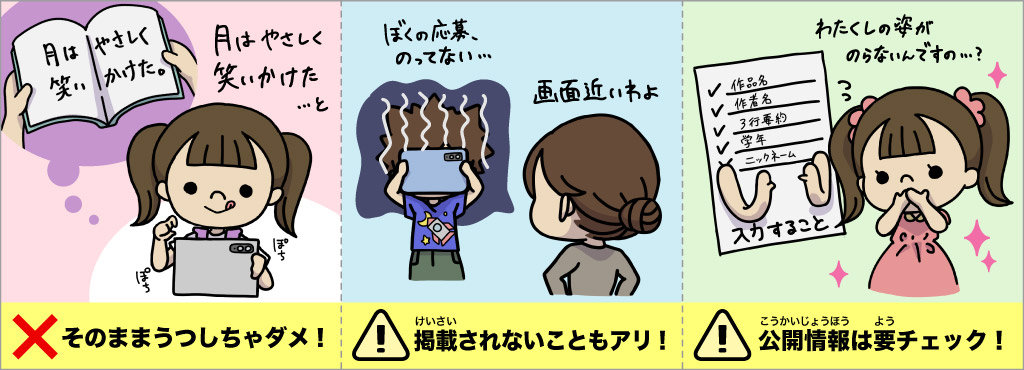 • 図鑑にのるときは、「作品名・作者名・3行要約・学年・ニックネーム」だけが公開されます。