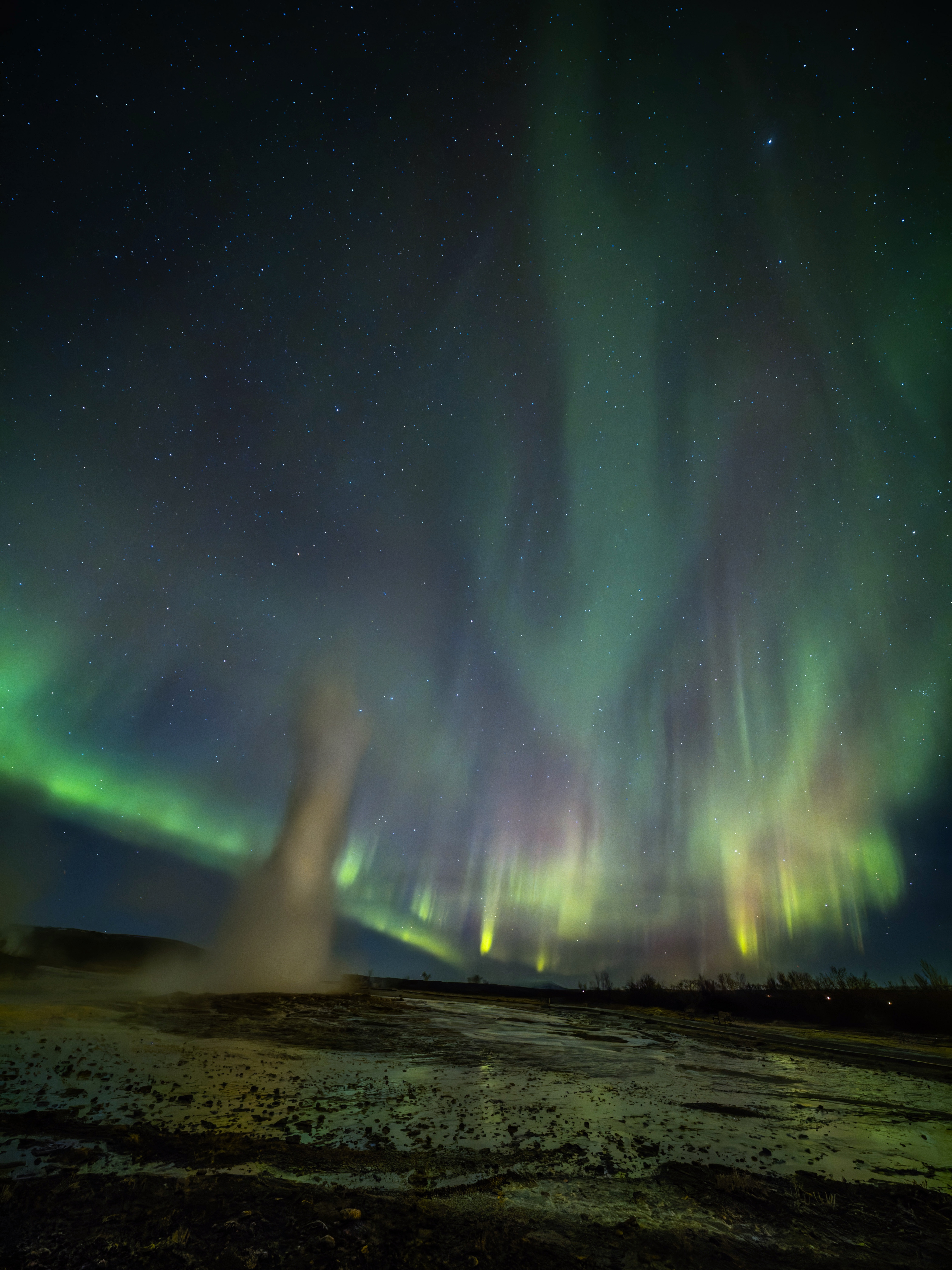 アイスランドのゲイシール地熱地帯において、全天を覆うように出現したオーロラと、間欠泉の噴出という二つの自然現象が同時に織りなす光景を捉えた、圧倒的な存在感を放つ作品です。ゲイシール地熱地帯は、「間欠泉(geyser)」という言葉そのものの語源となった場所であり、地球内部のエネルギーが風景として直接立ち現れる、きわめて象徴的な舞台と言えるでしょう。