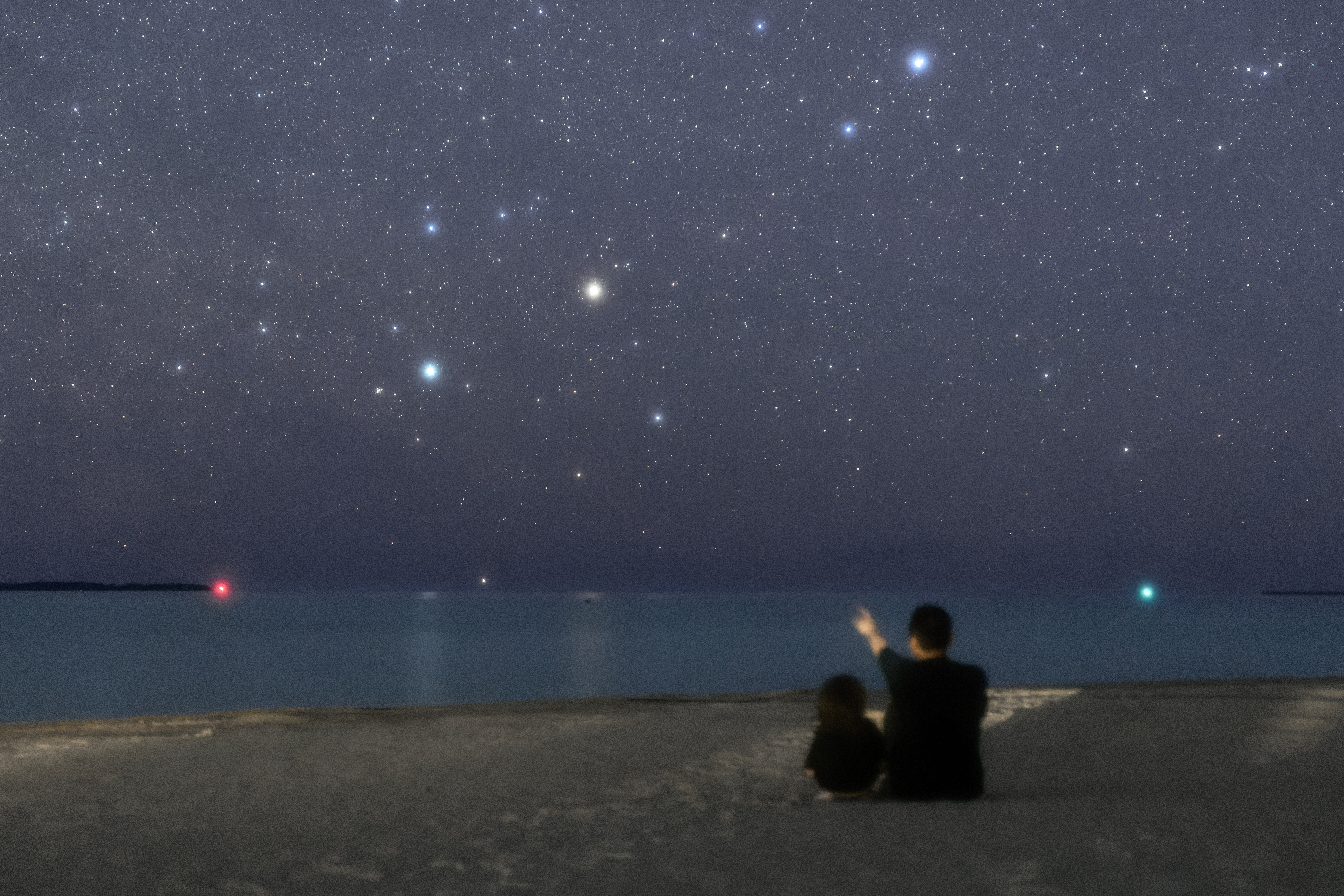 沖縄県・八重山諸島の小浜島で、6月末の天文薄明が終わる直前に撮影された、南の水平線ぎりぎりに浮かぶ南十字星が強く印象に残る作品です。撮影は、小さな娘さんとお父さん、二人きりで迎えた初めての星空観察の記念とのこと。夕暮れのサンゴ礁の砂浜で、日が沈むのを待ちながら一番星を探していた情景が自然と目に浮かびます。薄明が終わるころ、南の超低空に南十字星を見つけた、その瞬間を切り取った記念写真なのでしょう。