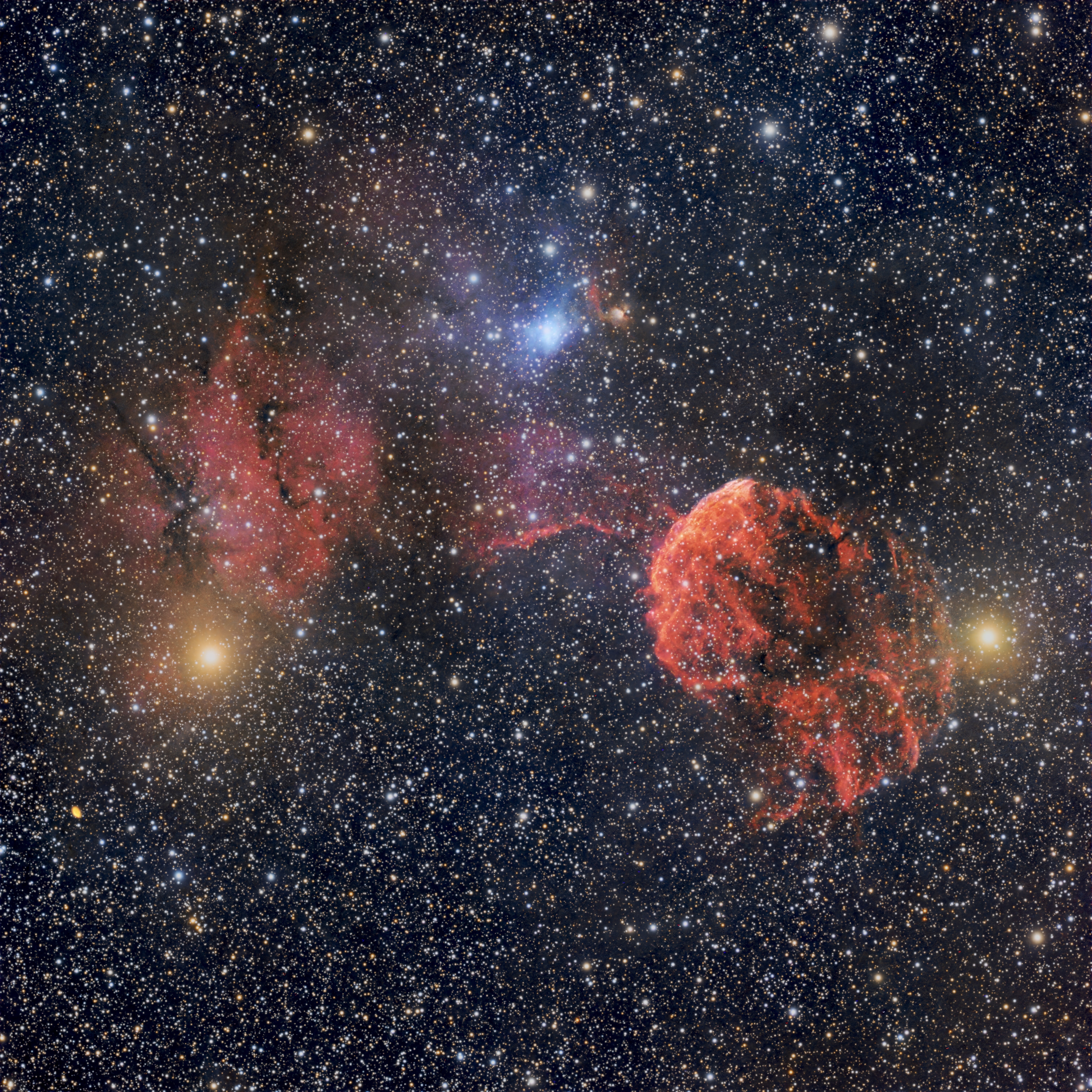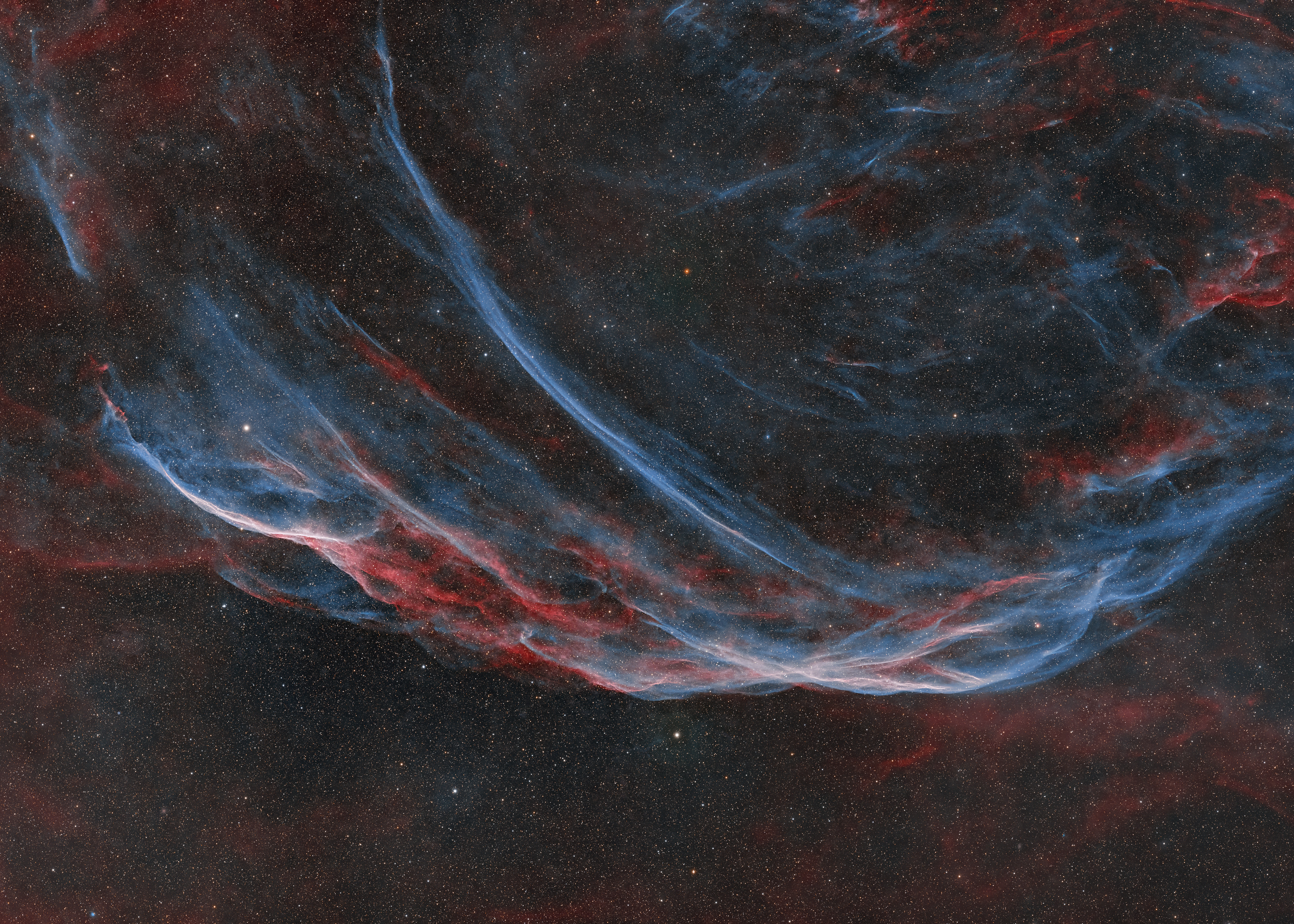 はくちょう座の超新星残骸「SH2-91」をモノクロCMOSカメラと Hα・OIII ナローバンドフィルターを用いて長時間にわたり撮影し、その微細な構造と階調を極めて高い完成度で描き出した一枚です。総露光時間約16時間という豊富なデータ量に加え、2台同架による異なるフィルターでの同時撮影という高度な撮影手法が、安定したデータ取得を可能にしています。