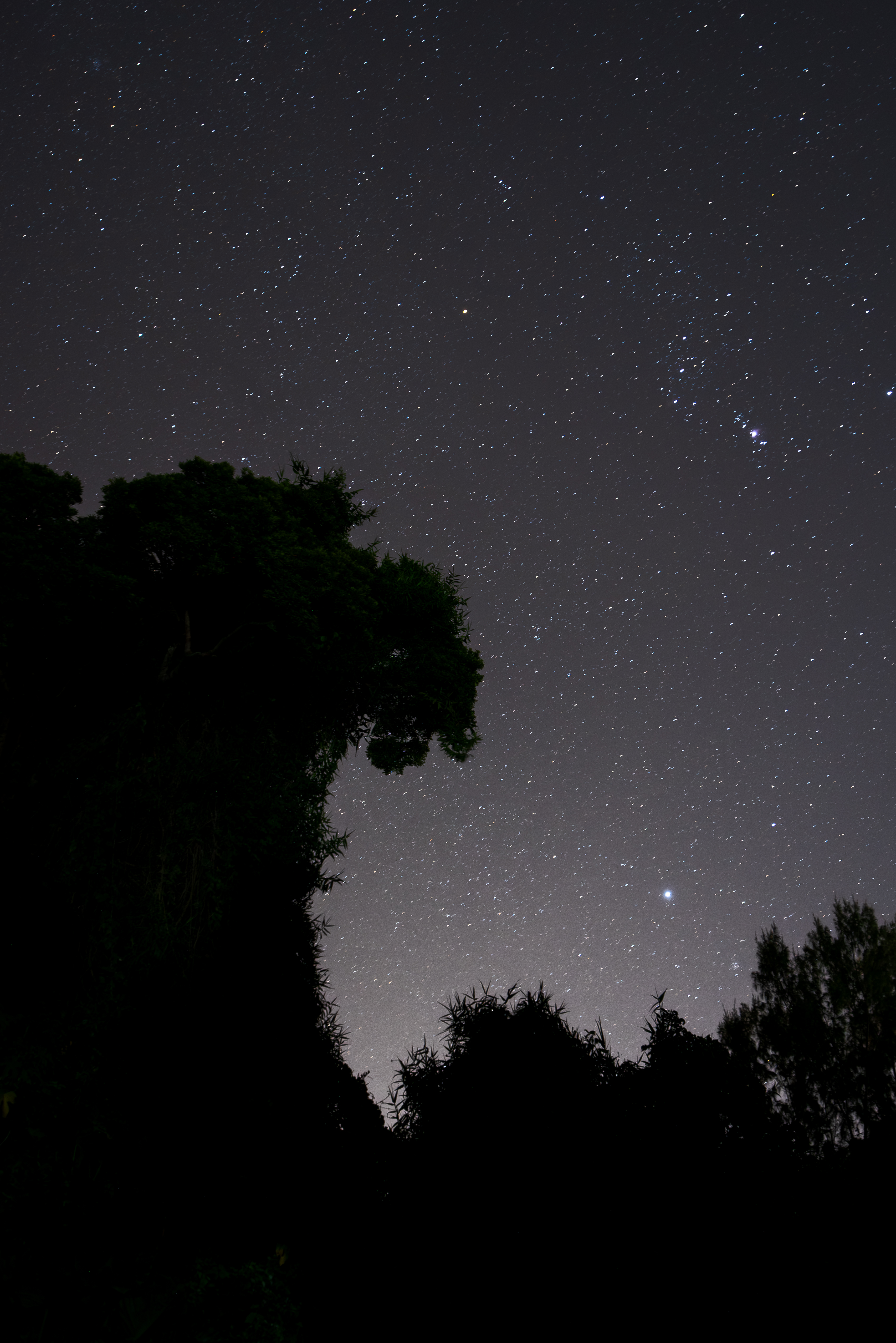 秋の夜、オリオン座やシリウスが昇り、深夜の公園を包む静けさの中で撮影された一枚です。作者が「ふと目の前の木々が、生き物のように立ち上がって見えました」と語るように、星々の淡い光に照らされた木々のシルエットが、非常に印象的な存在感を放っています。