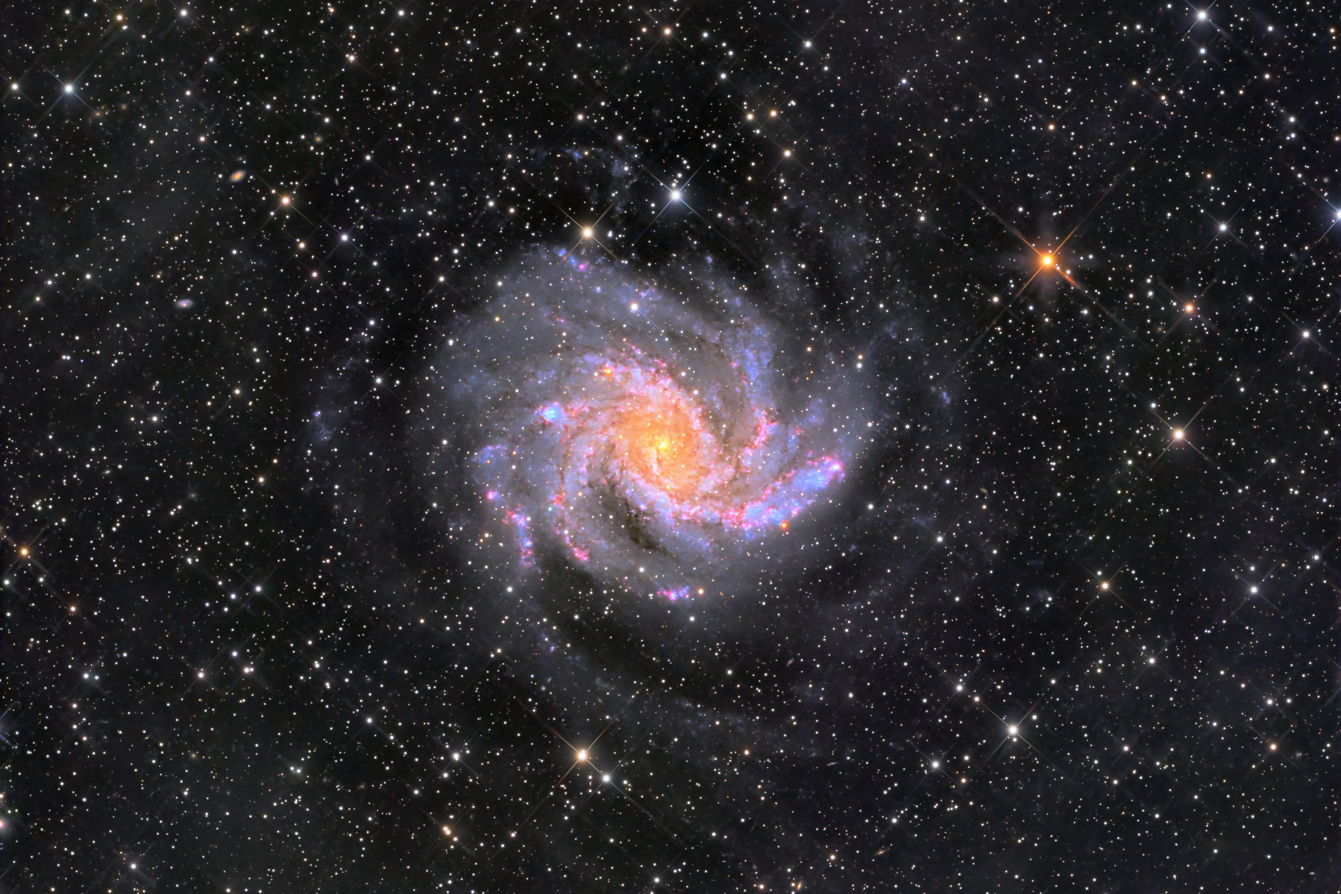 約2250万光年彼方、ケフェウス座とはくちょう座の境界付近に位置する中規模の渦巻銀河 NGC 6946。「花火銀河(ファイアワークス銀河)」の名で知られるこの銀河を、非常にディープかつ高精細に捉えた、美しさと情報量を兼ね備えた作品です。