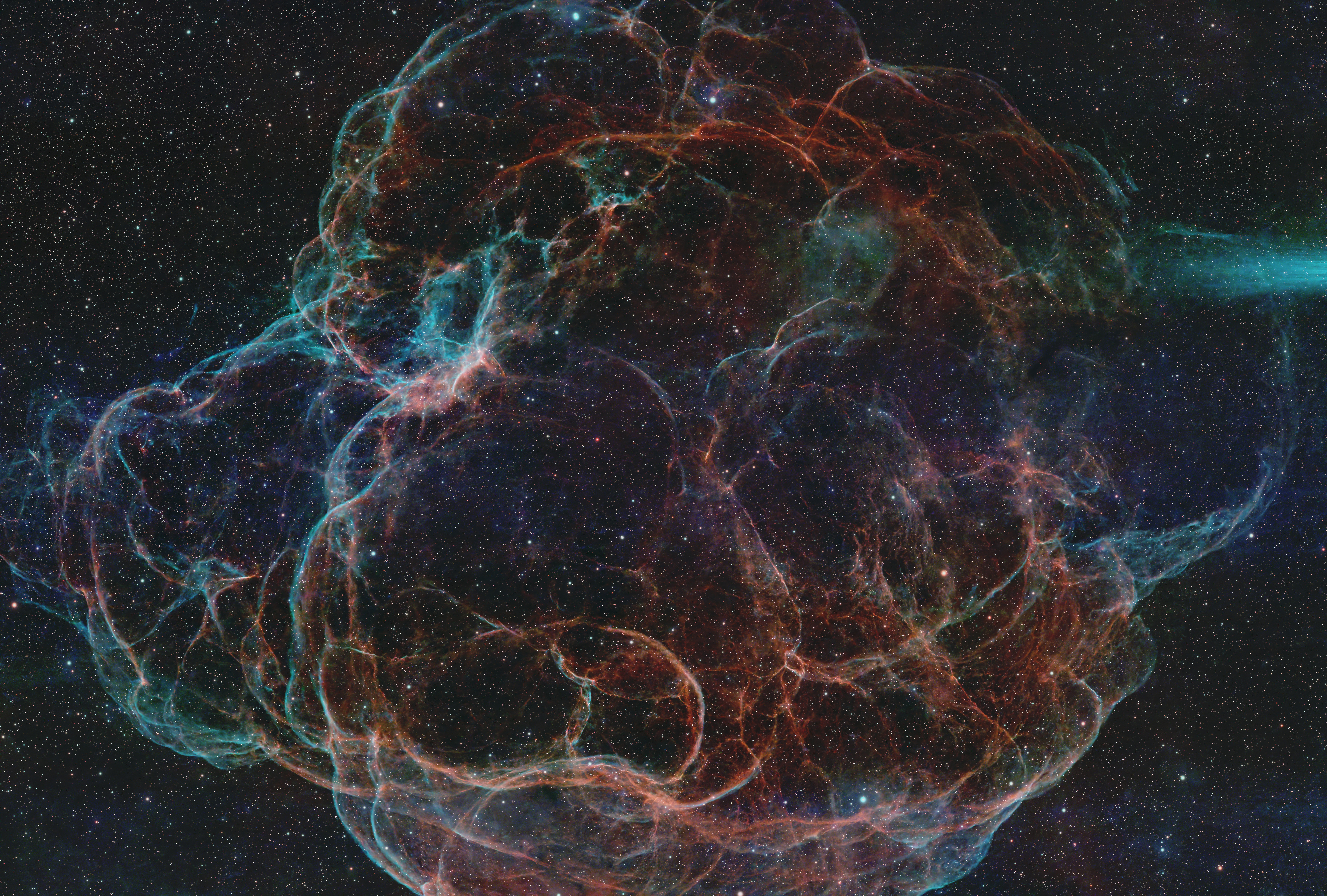 おうし座からぎょしゃ座付近にある超新星残骸「Sh2-240」をナローバンド撮影によって捉え、OIII の青と Hα の赤が複雑に絡み合う構造を緻密かつ大胆に描き出した一枚です。