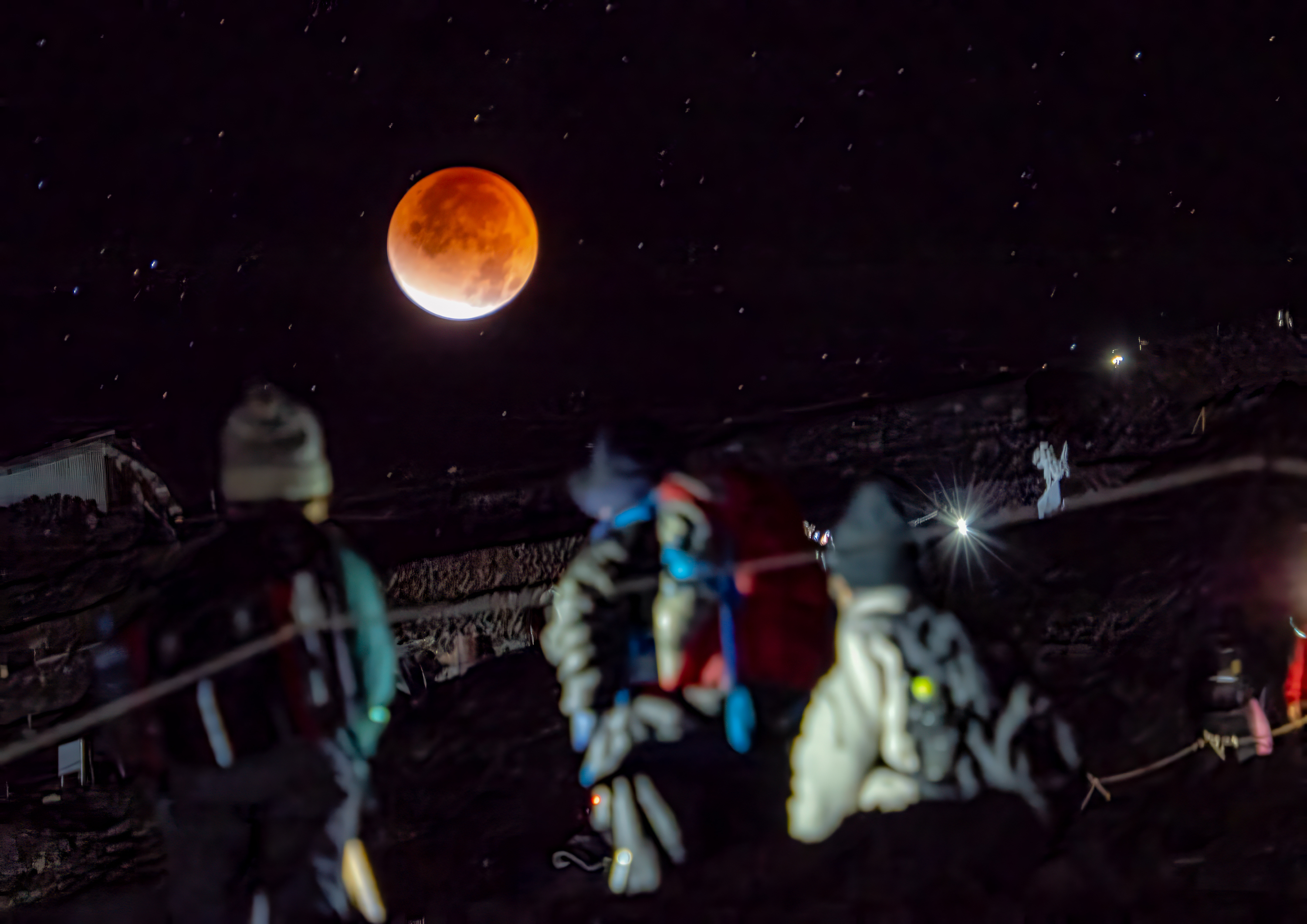 皆既月食という希少な天文現象を、日本最高峰・富士山の登山道の途上で捉えた作品です。赤銅色へと変化していく月の姿が、登山者たちのシルエットと重なり合うことで、この瞬間を共有する人間の存在が強く印象づけられています。