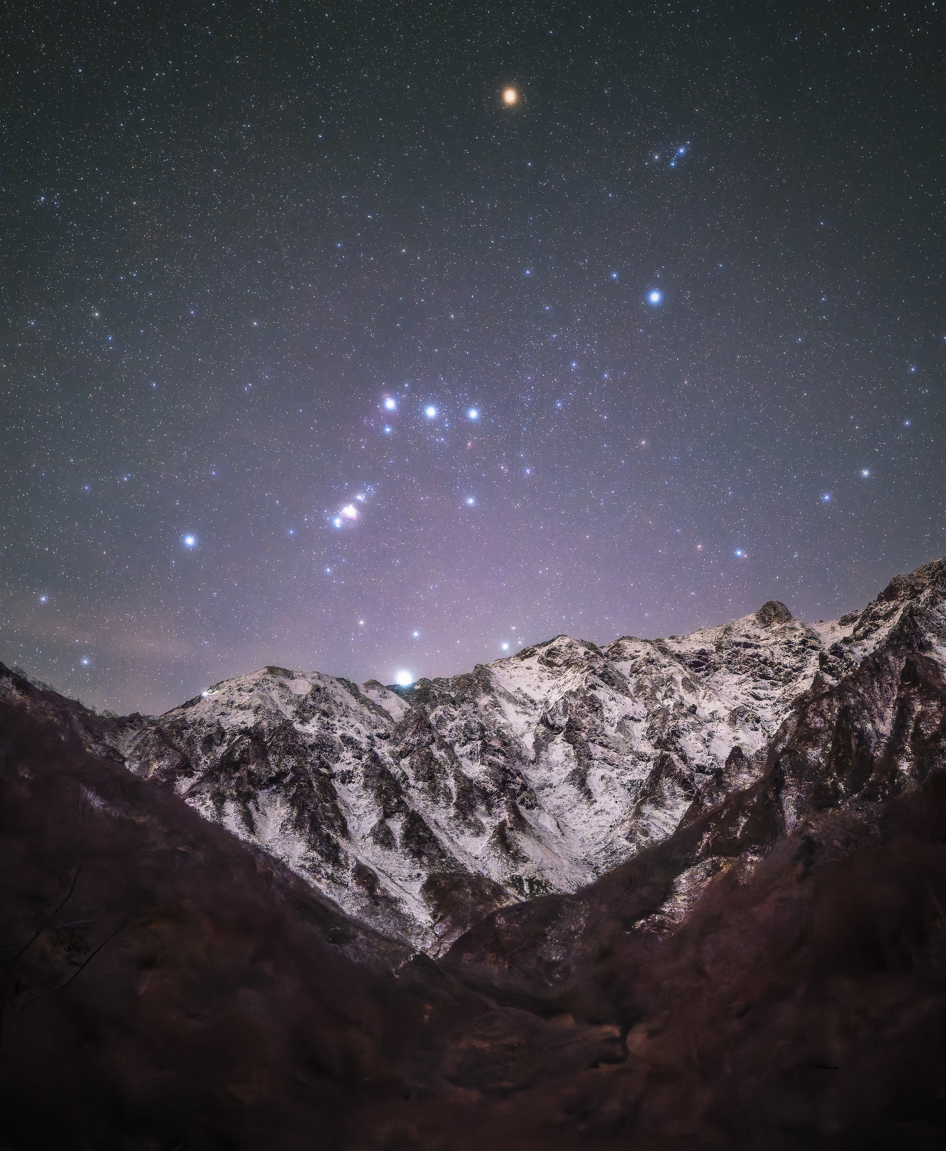 ソフトフィルターによって星の存在感を高めつつ、RAW現像の段階でシャープネスを巧みに調整し、谷川岳の岩壁を力強く、かつシャープに描写しています。オリオン座のリゲルが、ちょうど稜線にかかる一瞬を、超高感度・短時間露光のワンショットで確実に写し止めた点は、高い撮影技術と判断力を感じさせます。