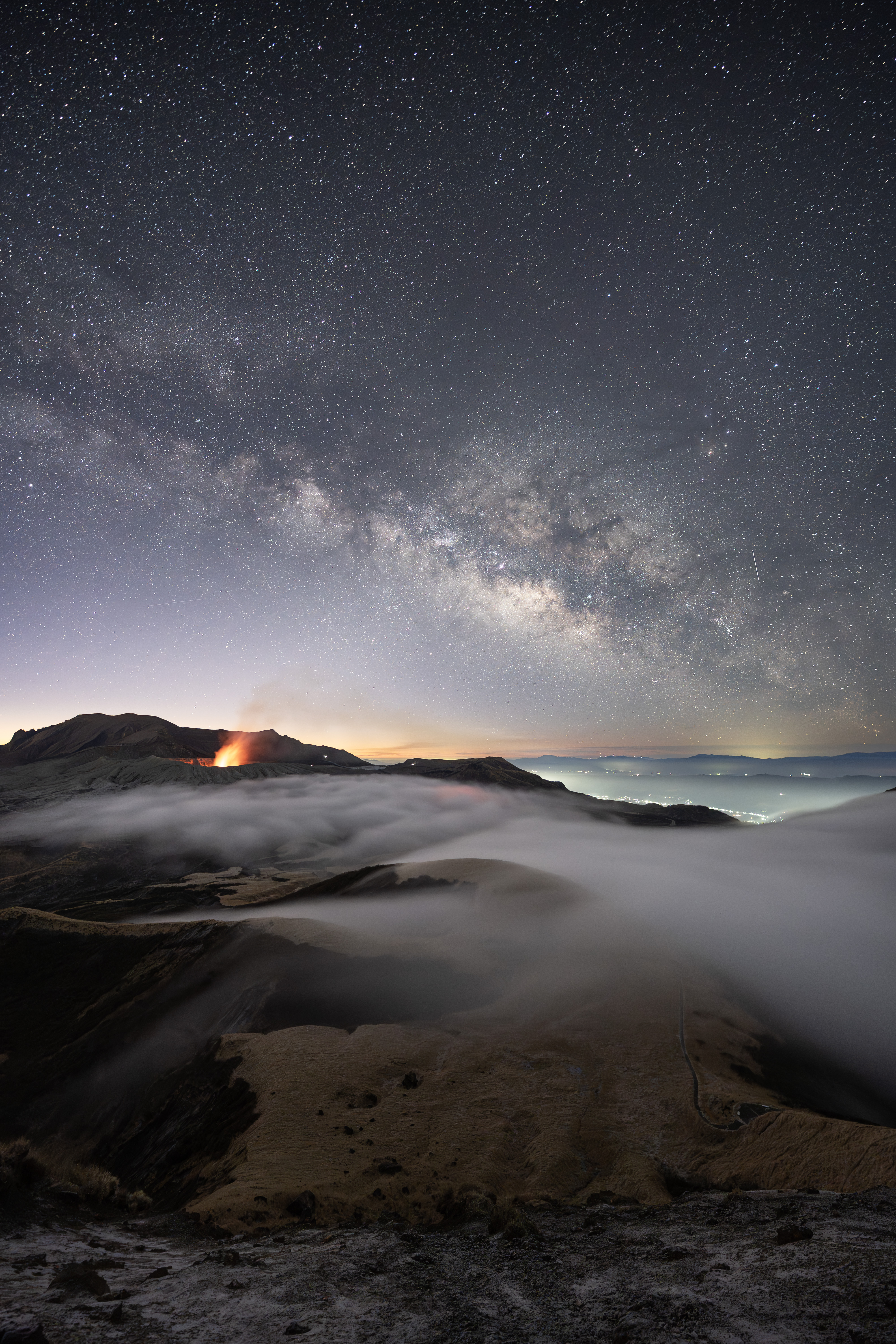 作者は、この瞬間を一度きりの偶然に委ねたのではなく、これまで何度もこのタイミングを狙い、構想を練り続けてきたに違いありません。そこへ雲海という自然の演出が加わり、その好機を確実に作品として結実させています。なお、作品中で噴火のように見える赤い光は、実際には中岳第一火口の「火映」です。また、夜明けの空に天の川が写真のように斜めにかかるのは、2月中旬から下旬にかけてのごく短い期間に限られます。こうした厳しい条件を理解した上で構図を組み立て、粘り強く撮影を続けてきた作者の構想力と継続力が、この完成度の高い一枚を生み出したと言えるでしょう。