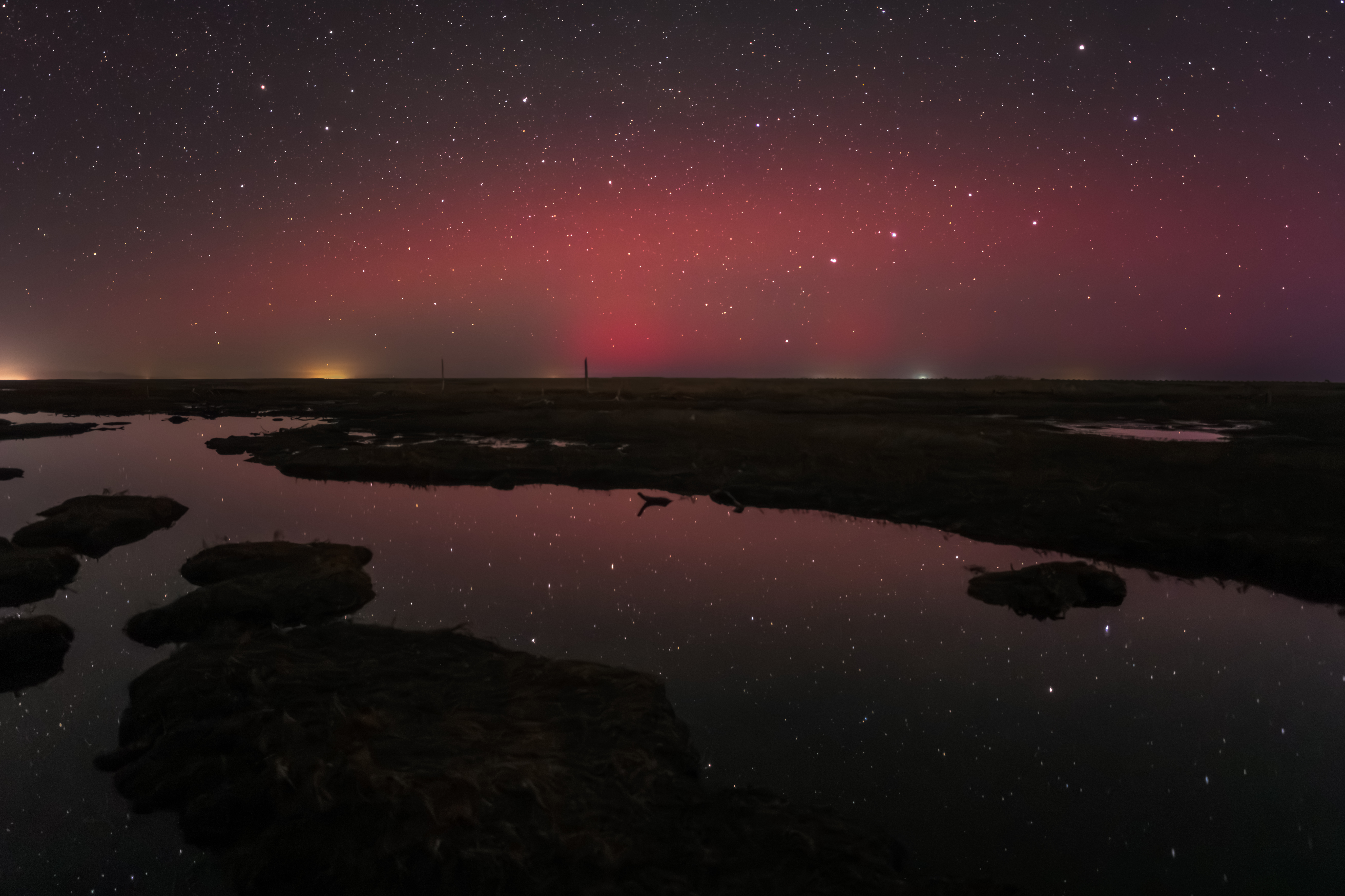 作者はこの磁気嵐の開始段階から撮影を行い、12日未明には、低緯度オーロラとしては極めて稀な、極域で見られるようなピラー状構造を伴う激しく変化するオーロラ現象を捉えることに成功しています。本作は、野付半島トドワラ付近からと思われる湿原の夜明け風景を前景に、ワンショットでその瞬間を的確に記録したものです。夜明けの空には北斗七星が昇り、時間の経過と天文現象が一枚の画面の中で交錯しています。