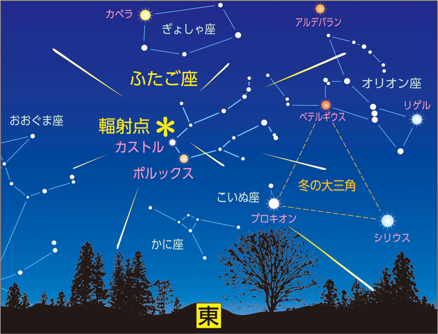 三大流星群の1つ、ふたご座流星群は、流星出現数トップクラス! 極大(※1)は12月14日(水)22:00頃で、その前後数日間は見られる可能性があります。ただし今年のふたご座流星群は月の方角に注意! 21:00〜23:00ぐらいに東から昇ってくるので、月明かりに目がくらまないよう、月が視界に入らない方向を向くことがポイントです。人工灯が少ない、条件の良い空であれば、1時間あたり40個ぐらい出現する予想。火球(とびきり明るい流星)も現れるかもしれません。流星群は極大時刻だけでなく、放射(輻射)点(※2)が天頂近くまで昇っている時間帯にもたくさん観察できるので、ふたご座が天頂に達する深夜1:30前後はチャンス大!
