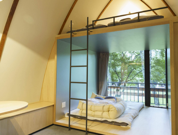 カプセル仕様のベッドが用意された、グループでもプライベートな空間を大切にできるキャビンです。