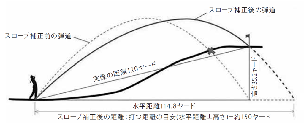 コースの傾斜に応じて実際に打つべき距離の目安を表示します。高低差があり距離感がつかみにくい時にも、クラブ選択を的確にアシストします。
