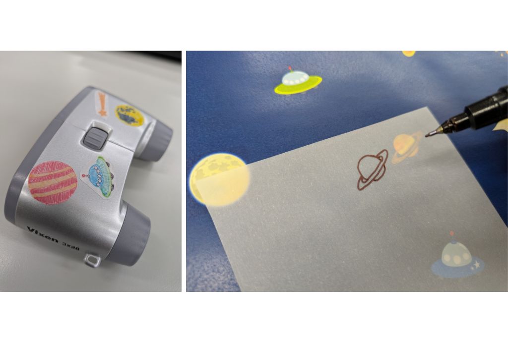 トレーシングペーパーに、好きな絵や模様を描いてシールを作成。できあがったオリジナルシールを使って、双眼鏡を自由に飾り付け、自分だけの特別なデザインに仕上げていきます。