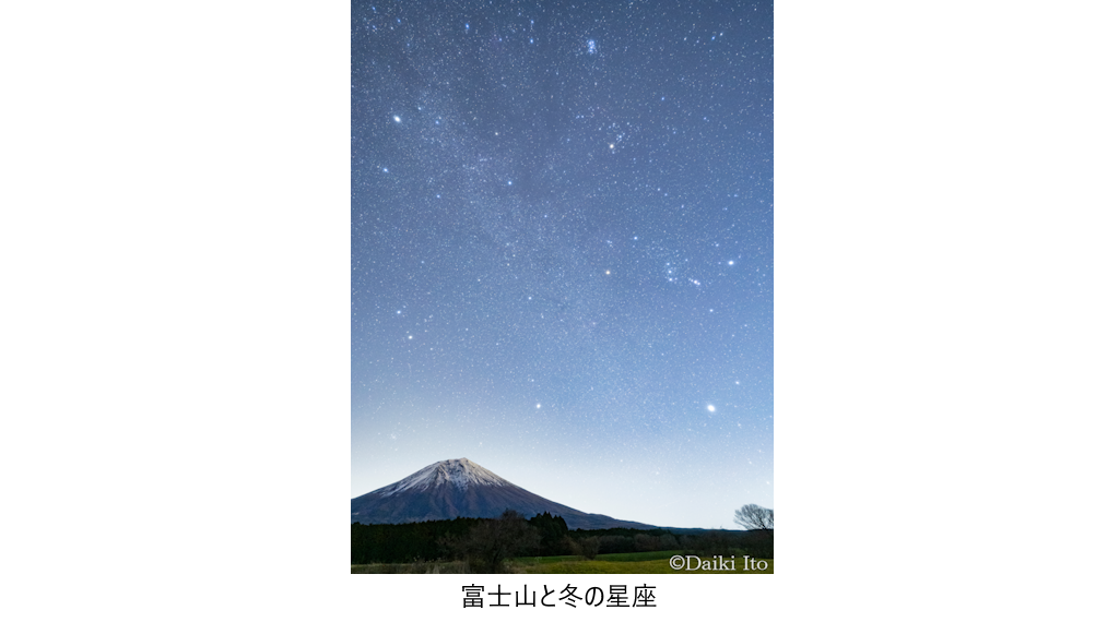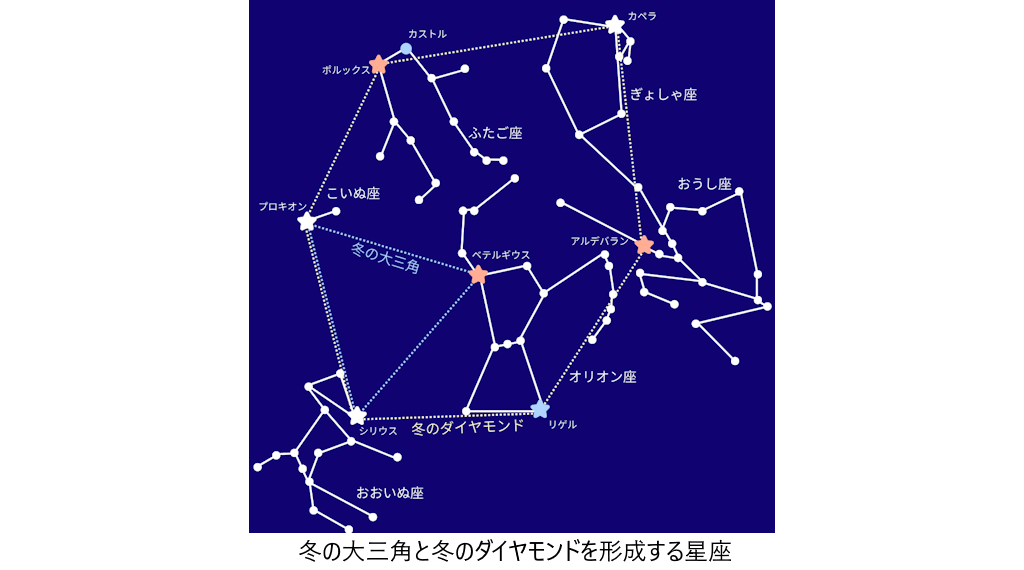 冬の夜空には明るい星や有名な星座が多く、それぞれの一等星を結ぶと「冬の大三角」と「冬のダイヤモンド」が夜空に浮かび上がります。