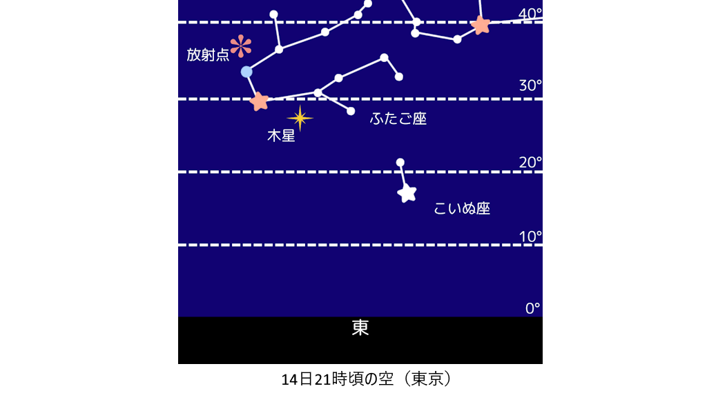 流星の放射点はふたご座付近にあります。極大日前後はふたご座付近に木星が輝いているため、放射点の位置がわかりやすいです。