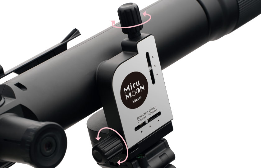ミルムーンは鏡筒部に、高度(上下)と方位(左右)を精密に調整できる2つの「微動ハンドル」を設けました。
