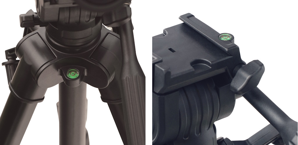「三脚本体(基部)」と「雲台(クイックシュー横)」の2箇所に水準器を搭載。