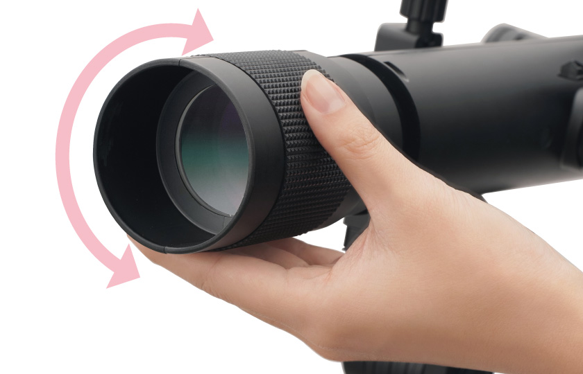 低倍率(25mm)の接眼レンズをのぞき、対物レンズ側のローレットを回してピントを合わせます。