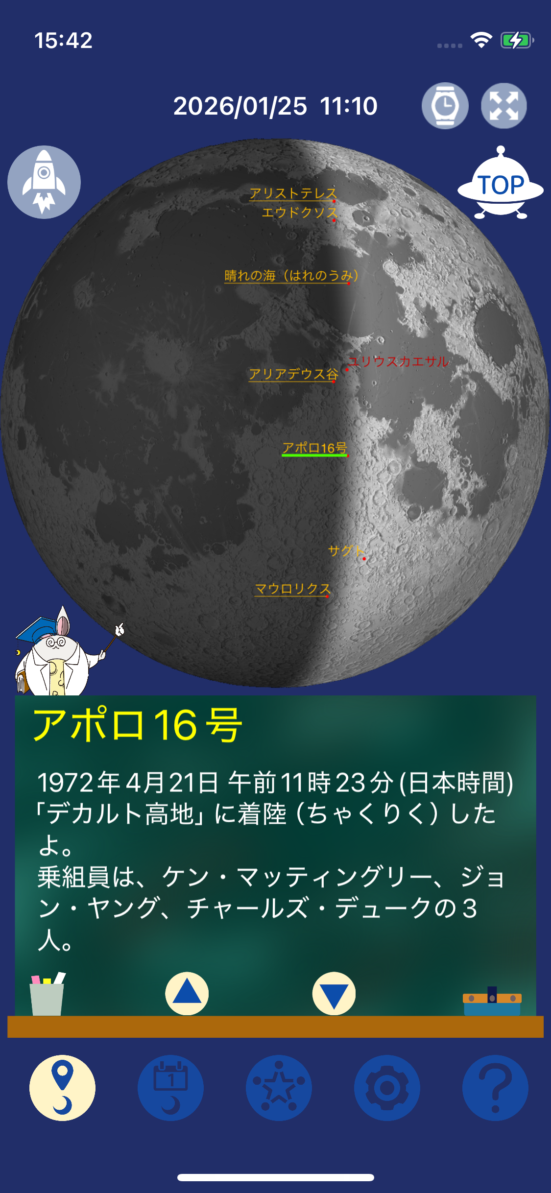 アプリを開くと、かわいらしいウサギのような案内人が登場。今夜の月が見える位置までご案内します。