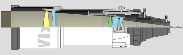 クラス最高峰の明るさF3.8を実現するとともに、645判をカバーする平坦な像面を確保、さらには青紫色のにじみ(青ハロ)を極限まで抑えるため、ビクセンが採用したのが新設計5群5枚のレンズ構成。前群にSDレンズ、後群にSDレンズを配することで、4群4枚構成(SDレンズ1枚)では補正しきれなかった青ハロ、さらには非点収差やコマ収差などの諸収差を極めて高いレベルで補正することに成功しました。