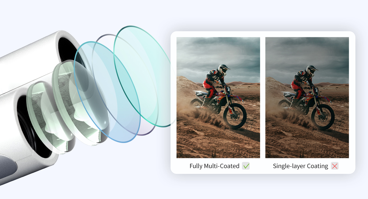 接眼・対物レンズに反射防止多層膜コートを施したマルチコート仕様です。光の反射やまぶしさを抑え、鮮やかな色彩と高いコントラストを実現。肉眼で見る以上に鮮明な視界をお楽しみいただけます。